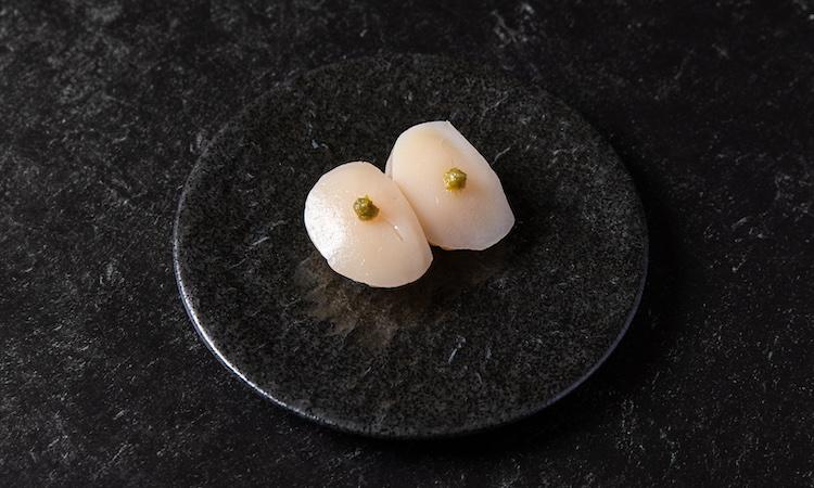 Hokkaido scallop nigiri topped with sea salt, lemon juice and yuzu koshō
