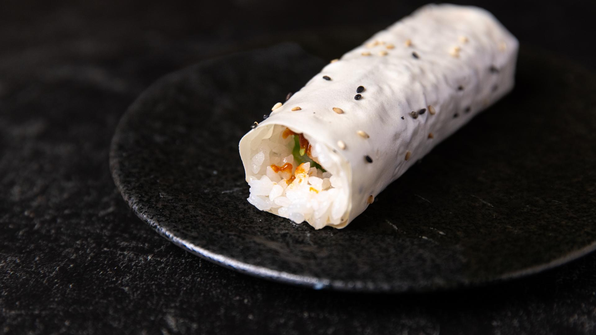 Avocado, asparagus, cucumber and gobo wrapped in seaweed.