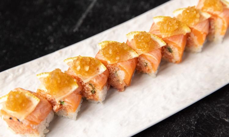 Spicy tuna with cucumbers topped with seared salmon, lemon, white onions. Soy paper wrapped.