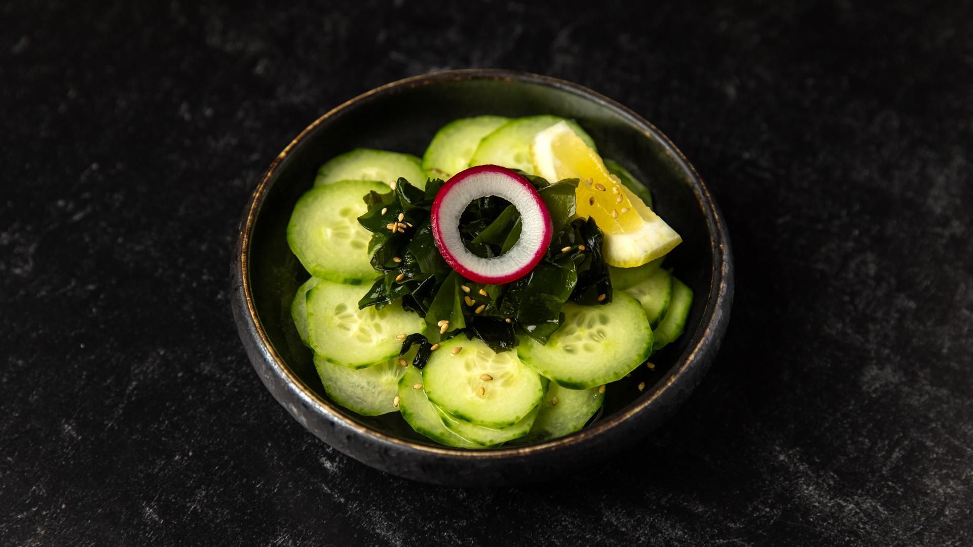 Albacore sashimi mixed with red onions and seaweed in a spicy ponzu sauce